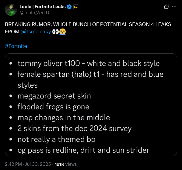 Di sana, dia mengklaim bahwa setelah kesimpulan pada 7 Agustus mengenai superhero saat ini/Superman-pass bertema pertarungan, penawaran berikutnya tidak hanya akan menampilkan perempuanHaloKulit Spartan sebagai Tier 1, hadiah yang bisa langsung diakses setelah membeli battle-pass, tetapi juga kulit Tommy Oliver pada Tier 100 terakhir, serta kulit MegaZord sebagai hadiah ‘rahasia’.