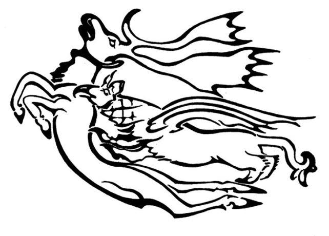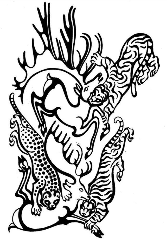 Di lengan kirinya, seekor binatang seperti moose atau rusa sedang diserang oleh makhluk yang menyerupai griffin. Di lengan kanannya, tato yang paling rumit dari semua: dua hewan berkuku belah dengan tanduk, terlibat dalam pertarungan hidup atau mati dengan dua harimau dan satu macan.
