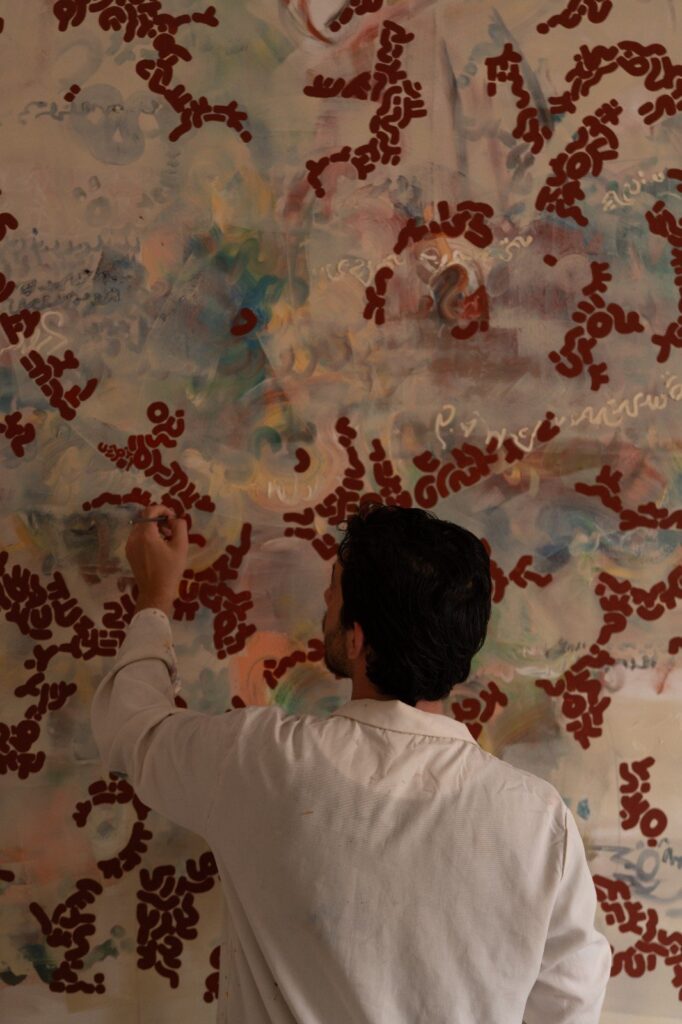 A:Bahasa ini muncul secara intuitif. Mulanya berupa gerakan-gerakan — gerakan insting — dan secara bertahap berkembang. Saya tidak pernah bermaksud menciptakan aksara baru; itu terjadi begitu saja. Orang-orang menempatkan makna yang berbeda pada bahasa ini: ada yang melihatnya sebagai kaligrafi Arab, yang lain melihat Ibrani, Sanskerta, atau simbol suku Somali. Seorang wanita dari Somalia pernah mengatakan kepadaku bahwa bahasa ini mengingatkannya pada tanda-tanda pengembara. Saat itu saya menyadari: bahasa ini bukan hanya milik saya. Terasa kolektif, turun-temurun. Saya menyebutnya sebagai bahasa universal bukan karena dipahami secara intelektual, tetapi karena ia beresonansi dengan ingatan, dengan tubuh, dengan perasaan.